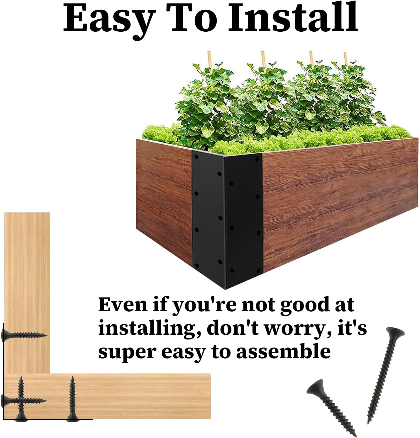 Specification:Product Name: Raised Garden Bed Corner BracketSize: Height is 11 inches, molded corners are 3inchx3inch. Long screws are 1.5 inches, short screws are 0.9 inchesThere may be 1-2inch error due to manual measurementMaterial: SteelColor: BlackParts List:4×Brackets 12×Long Screws36×Short Screws Description:This raised garden bed corner bracket is suitable for any shape with right angles. It is made of premium steel material, rustproof and durable. It adopts countersunk design of the mounting holes to make sure screws do not protrude. It is easy to install and use. Feature:Durability: This garden bed corner bracket adopts high quality metal material to ensure durability. It fits for any shape with right angles. Easy to Use: This garden bed corner bracket connector is easy to assemble and use, which is suitable not only for garden beds, but also for wooden tables and chairs, etc. Notes:1.There may be slight differences between the picture and the actual color of the commodity. We will try our best to show you the exact color.2.Please allow slight dimension difference due to manual measurement.