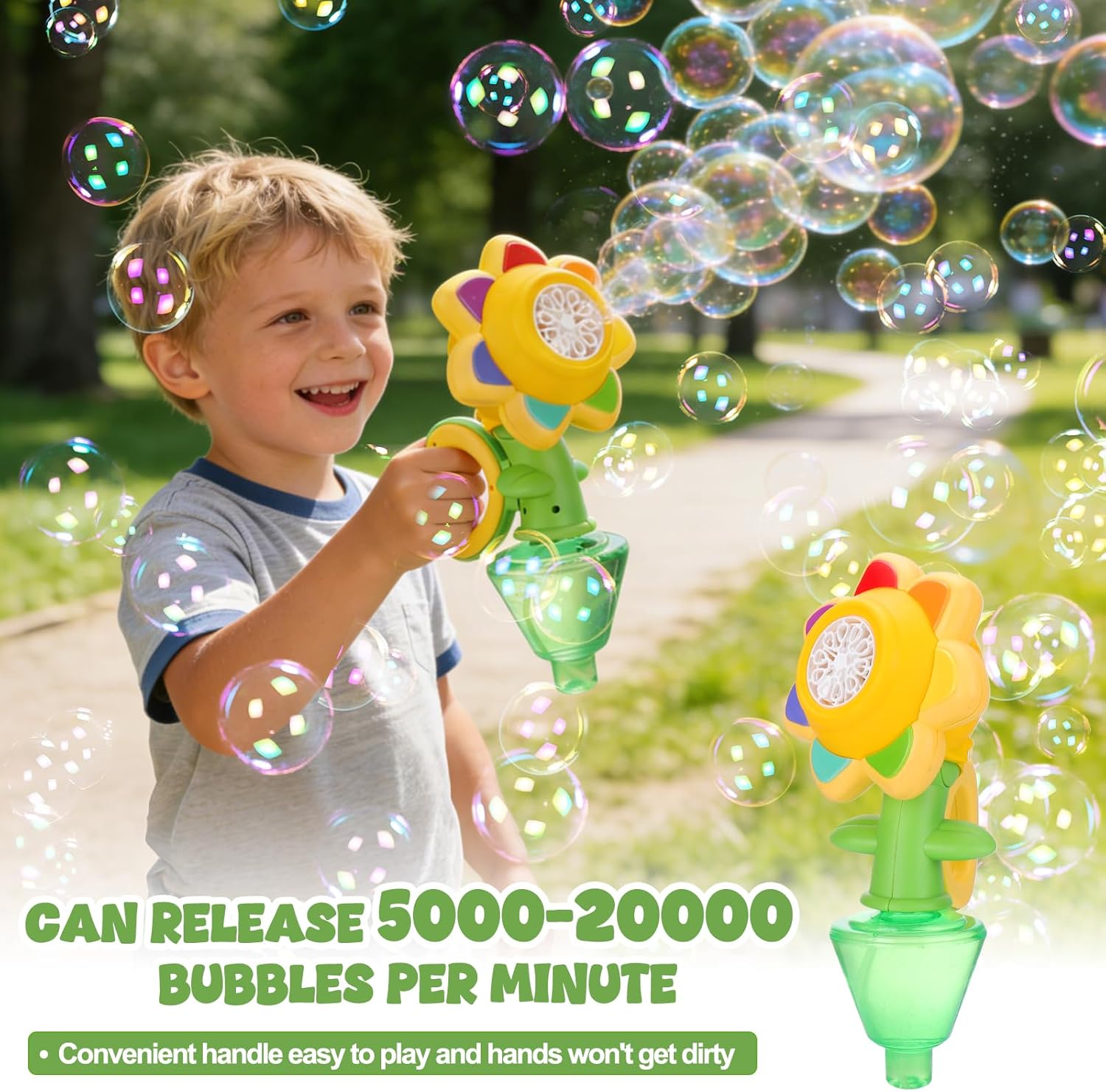 • Rotating flowers with LED lights:This Sunflower bubble machine automatic rotating bubble head, built-in multi-color LED lights, designed with dance movements. During the day, it is a delicate garden decoration, and at night it transforms into a glowing stage light Adults use it to make the bedroom/pool/party corners INS style check-in points. Children holding hands and spinning dance like fairy tale protagonists, not only toys but also carriers of growth memories